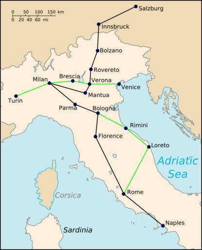 | Keywords: Mozart in Italy.svg en Map showing main centres visited during first Italian journey December 1769 to March 1771 The black line shows the main outward route from Salzburg to Naples The green line marks detours taken during the return journey Base File Map of Italy-it svg by User F l a n k e r Data File MozartItalyMap2 jpg by User Brianboulton based on journey account in cite book Sadie Stanley 2006 Mozart The Early Years 1756-1781 W W Norton Co 0-393-06122-4 Self-made by Jappalang 2009-01-17 Mozart in Italy de svg Mozart in Italy sr svg File MozartItalyMap2 jpg SVG maps of Italy Wolfgang Amadeus Mozart |