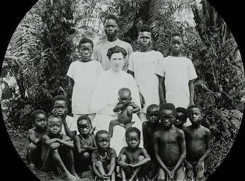 | Keywords: Mrs Stannard and group, Congo, ca. 1900-1915 (IMP-CSCNWW33-OS10-63).jpg en <br> Mrs Stannard and group Congo ca 1900-1915 Black and white lantern slide featuring a European female missionary with a group of Congolese small boys and adolescents In consultation with other photographs of the period the female missionary is likely to be a Mrs Stannard A group of small boys sits in front of Mrs Stannard wearing loincloths although two boys wear shirts Mrs Stannard holds a boy baby on her knee Four adolescents - three boys and one girl - stand behind her The group poses in a bushland background This slide comes from a collection generated by missionaries working for the Congo Balolo Mission a mission begun in 1889 under the supervision of the East London Training Institute for Home and Foreign Missions that developed into the interdenominational evangelical mission Regions Beyond Missionary Union after 1900 Photographer Unknown Subject personal name Stannard Filename IMP-CSCNWW33-OS10-63 tif Coverage date 1900/1915 Subject unesco Missionary work Part of collection International Mission Photography Archive ca 1860-ca 1960 Part of subcollection Photographs from the Centre for the Study of World Christianity University of Edinburgh U K ca 1900-ca 1940s Subject corporate name Congo Balolo Mission Repository name Centre for the Study of World Christianity Archival file Volume2/IMP-CSCNWW33-OS10-63 tif Repository address The University of Edinburgh School of Divinity New College Mound Place Edinburgh EH1 2LX United Kingdom Geographic subject country Congo Format aacr2 lantern slides 8 2 x 8 2cm Geographic subject continent Africa Rights Contact the repository for details Part of series Regions Beyond Missionary Union Congo Lantern Slides CSCNWW33/OS10 Repository email divinity-CSWC ed ac uk Date created 1900/1915 Publisher of the digital version University of Southern California Libraries Subject aat genre group portraits Format aat lantern slides; photographs Access conditions http //www ed ac uk/schools-departments/divinity/research/centres/world-christianity/collections-resources Geographic subject educational facilities File CSCNWW33/OS10/63 Subject lcsh Women missionaries; Boys; Portraits group 1900/1915 date created author http //digitallibrary usc edu/cdm/ref/collection/p15799coll123/id/78069 PD-old-70-1923 Magic lantern images Images from USC Digital Library uploaded by Fæ International Mission Photography Archive ca 1860-ca 1960 |