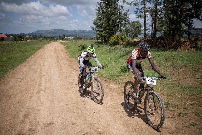 Keywords: vehicle bike outdoor sport motorcycle KENYA, Meru: In a photograph taken by Make It Kenya 22 Novemebr 2015, a two-man cycling team cycles through rural farmland on day two of the Mt Kenya Epik cycling challenge near the town of Timau in Meru County, 250km north of the Kenyan capital Nairobi. The cycling challenge, taking place between 21-24 November, has over 30 cyclists both local and international professionals covering more than 300km through central Kenya. David Kinjah, Epik founder and training partner to two-time Tour-De France champion Chris Froome, hopes the event creates awareness of conservation projects around the Mt. Kenya region, which address the issues arising as a result of human-wildlife conflict and management of natural resources, particularly in water catchment areas. Kinjah who recently came back from the Cairo-Cape cycling challenge said that the Epik is a good opportunity to further engage the youth of the country and provide them with a platform to be involved in something worthwhile. "Kenyan cycling is still at the grassroots level and that's a good thing," Kinjah said adding that young cyclists come from rural areas and are enthusiastic about a sport that looks to have a bright future in the East AFrican country. MANDATORY CREDIT: MAKE IT KENYA PHOTO / STUART PRICE. KENYA, Meru: In a photograph taken by Make It Kenya 22 Novemebr 2015, a two-man cycling team cycles through rural farmland on day two of the Mt Kenya Epik cycling challenge near the town of Timau in Meru County, 250km north of the Kenyan capital Nairobi. The cycling challenge, taking place between 21-24 November, has over 30 cyclists both local and international professionals covering more than 300km through central Kenya. David Kinjah, Epik founder and training partner to two-time Tour-De France champion Chris Froome, hopes the event creates awareness of conservation projects around the Mt. Kenya region, which address the issues arising as a result of human-wildlife conflict and management of natural resources, particularly in water catchment areas. Kinjah who recently came back from the Cairo-Cape cycling challenge said that the Epik is a good opportunity to further engage the youth of the country and provide them with a platform to be involved in something worthwhile. "Kenyan cycling is still at the grassroots level and that's a good thing," Kinjah said adding that young cyclists come from rural areas and are enthusiastic about a sport that looks to have a bright future in the East AFrican country. MANDATORY CREDIT: MAKE IT KENYA PHOTO / STUART PRICE.