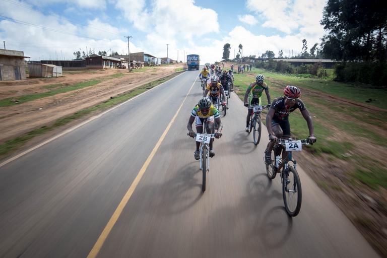 Keywords: road outdoor freeway KENYA, Laikipia: In a photograph taken by Make it Kenya 24 November 2015, riders cycle in a group downhill towards Timau town in Laikipia County, 250km north of the Kenyan capital Nairobi, on the fourth and final day of the Mt. Kenya Epik cycling challenge. The 4-day mountain biking adventure challenge race circumnavigates the Mount Kenya region and this inaugural event attracted both Kenyan and international riders from as a far afield as Norway and Japan. The Epik was established to attract sports tourism to the Mt. Kenya region and showcase what it has to offer the outdoor, extreme sports enthusiast while providing riders the opportunity to interact with local communities and witness some of the beautiful scenery and landscapes surrounding Mt. Kenya that otherwise might not seen. The two-man team of Kenyan riders Joseph Echuwa and Samwel Mwangi won the 300km, 4-day race crossing the finish line in 10hrs 31mins and 05secs. MANDATORY CREDIT MAKE IT KENYA PHOTO / STUART PRICE. KENYA, Laikipia: In a photograph taken by Make it Kenya 24 November 2015, riders cycle in a group downhill towards Timau town in Laikipia County, 250km north of the Kenyan capital Nairobi, on the fourth and final day of the Mt. Kenya Epik cycling challenge. The 4-day mountain biking adventure challenge race circumnavigates the Mount Kenya region and this inaugural event attracted both Kenyan and international riders from as a far afield as Norway and Japan. The Epik was established to attract sports tourism to the Mt. Kenya region and showcase what it has to offer the outdoor, extreme sports enthusiast while providing riders the opportunity to interact with local communities and witness some of the beautiful scenery and landscapes surrounding Mt. Kenya that otherwise might not seen. The two-man team of Kenyan riders Joseph Echuwa and Samwel Mwangi won the 300km, 4-day race crossing the finish line in 10hrs 31mins and 05secs. MANDATORY CREDIT MAKE IT KENYA PHOTO / STUART PRICE.
