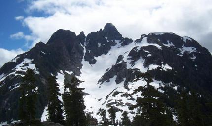 | Keywords: Mt Septimus.png en Mount Septimus NW aspect Photo taken from near Cream Lake The thin line of vertical snow in the middle of the picture is the standard route to the summit It is often refered to as the X-gullies Own Fraser harris 2006-07-15 Vancouver Island Ranges Strathcona Provincial Park |
