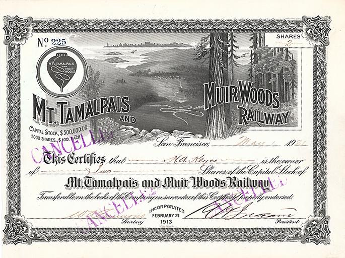 | Keywords: Mt. Tamalpais & Muir Woods Railway 1921.jpg de Share of the Mt Tamalpais Muir Woods Railway from the 1st May 1921 1921-05-01 http //www gutowski de/Katalog-61/Katalogbilder/1013 jpg Unbekannte Autoren und Grafiker; Scan von Auktionshaus Vladimir Gutowski other versions PD-old-70-1923 Stock certificates from the United States |
