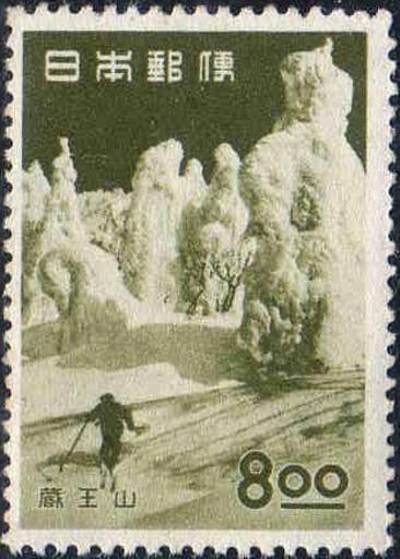 Keywords: Mt. Zao 8Yen stamp.JPG ja 日 の観光 百選で山岳部 位になった蔵王山の樹氷を描く切手 personal stamp collection Japan Post 1951-02-15 Stamps of Japan 1951 Yamagata Zao Onsen Ski resort PD-Japan
