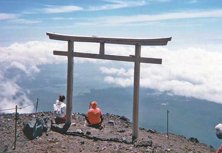 Keywords: MtFujiTorii.jpg Torii near summit of Mt Fuji Honshu Japan volcano volcanic cone english wikipedia uploaded by en User Fg2 on 03 Jul 2004 en User Fg2 released in english wikipedia under PD by author Fg2 Climbing Mount Fuji Wooden torii MyĆjin-torii |