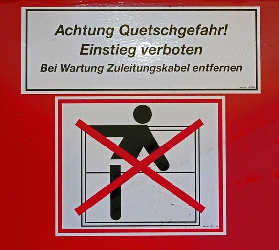 | Keywords: Müllpresse Warnung.JPG en Warning sign at a trash compactor Do not enter For maintenance remove electrical power cable de Warnschild an deiner Müllpresse die Mülllsäcke zerkleinert und kompaktiert own Stefan Bellini 2015-12-29 WTFPL Taken with Sony DSC-HX90 Files by User Stefan Bellini - Photos taken in Lower Saxony Warning signs in Germany Warning signs related to injuries Caution signs Danger of death signs 2015 in Göttingen German language signs Red signs Cc-zero | ||||