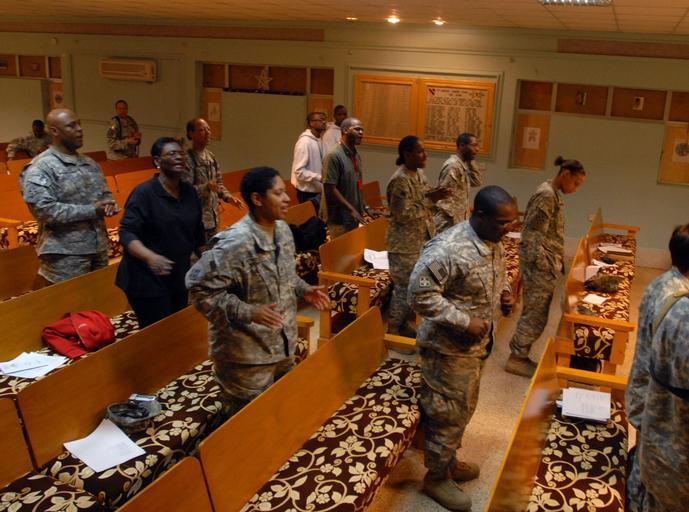 | Keywords: Multi-National Division - Baghdad Soldiers party all night to christen New Year DVIDS140292.jpg en Soldiers from the 1st Brigade Combat Team 4th Infantry Division Multi-National Division - Baghdad and civilians attend a New Years church service at the Steel Falcon Memorial Chapel Dec 31 2008 to practice their faith and celebrate the new year minutes before the beginning of 2009 at Forward Operating Base Falcon in southern Baghdad's Rashid District The 1st Raider Brigade Soldiers attended many New Year's events at FOB Falcon to celebrate the holiday 2008-12-31 Sgt 1st Class Brent Williams https //www dvidshub net/image/140292 140292 2009-01-01 13 41 BAGHDAD IQ PD-USGov Forward Operating Base Falcon Images from DoD uploaded by Fæ |