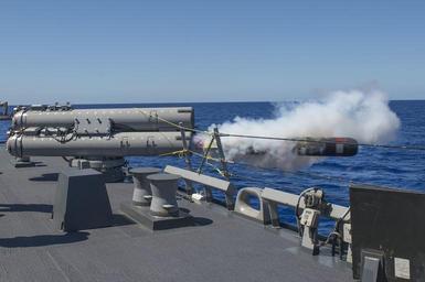 | Keywords: Multi-Sail 2015 150323-N-BB269-219.jpg en 150323-N-BB269-219 WATERS NEAR GUAM March 23 2015 Arleigh Burke-class guided-missile destroyer USS Curtis Wilbur DDG 54 fires a torpedo at a simulated target during Multi-Sail 2015 Multi-Sail 2015 is an annual Destroyer Squadron 15 exercise designed to assess combat systems improve teamwork and increase warfighting capabilities in the Seventh Fleet area of responsibility U S Navy photo by Mass Communication Specialist 3rd Class Raymond D Diaz III/Released 2015-03-23 Petty Officer 3rd Class Raymond Diaz III https //www dvidshub net/image/1835736 150323-N-BB269-219 2015-03-24 17 58 USS CURTIS WILBUR AT SEA PD-USGov-Military-Navy USS Curtis Wilbur DDG-54 Multi-Sail 2015 Images from DoD uploaded by Fæ |