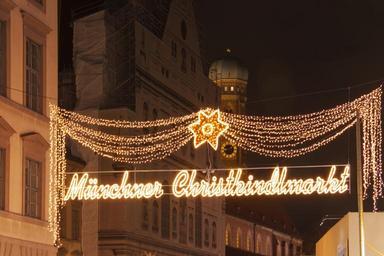 Keywords: munich christmas market spire frauenkirche lights lettering signage garland star christmas yellow night photograph