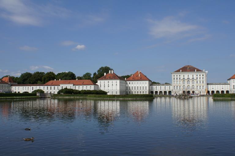 Keywords: munich lake mirroring bavaria castle nymphenburg castle water blue sky park nymphenburg castle park germany romantic property