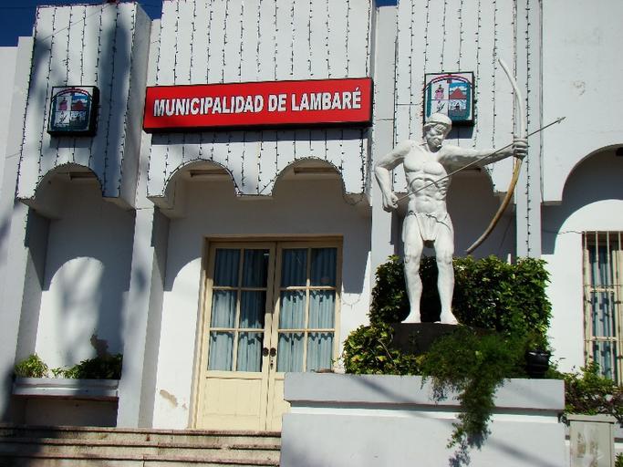 Keywords: Municipalidad Lambare.JPG Fachada de la Municipalidad de Lambaré delante; la estatua del Cacique Lambaré Own date Luis206py Statues in Paraguay Statues of archers Central Department Lambaré