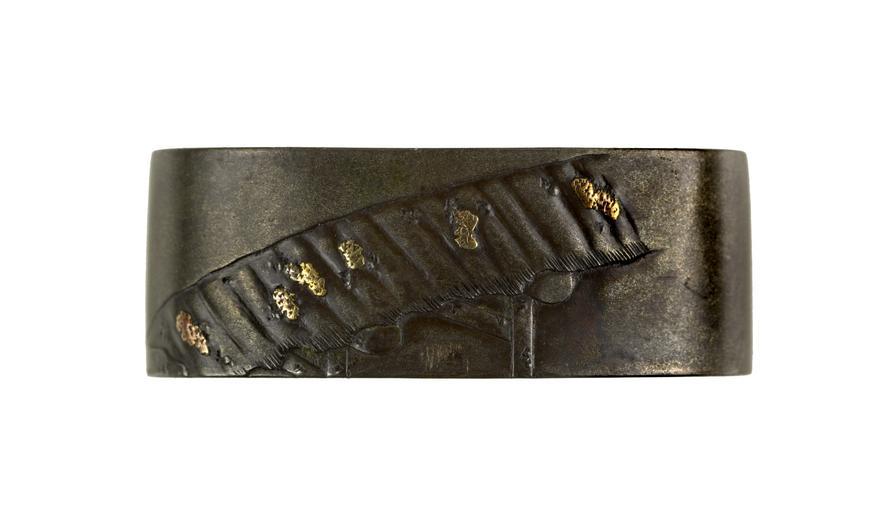 | Keywords: Murakoshi Shigeyuki - Fuchi with Chôryô Holding Kôsekikô's Shoe - Walters 51980 - Back.jpg The figure on this fuchi is the Chinese government minister Chry Ch Zhang Liang Chang Liang who lived in the 3rd century BC In his hand is a shoe belonging to the legendary elder Ksekik Ch Huangshi Gong Hwang Shi Kung While riding a mule across a bridge Ksekik dropped his sandal Chry returned it to him As a reward Ksekik gave Chry a book of military strategy Later Chry helped to establish the Han Han Dynasty 207 BC-AD 220 This fuchi is paired with a kashira depicting Ksekik Walters 51 981 ca 1800 Edo shibuichi gold cm 3 7 l accession number 51 980 40531 William T / Henry Walters Collection Baltimore date and mode of acquisition unknown Walters Art Museum Henry Walters Acquired by William T or Henry Walters Signature Shigeyuki place of origin Edo present-day Tokyo Japan Walters Art Museum license Fuchi in the Walters Art Museum Murakoshi Shigeyuki Kōsekikō Chōryō |