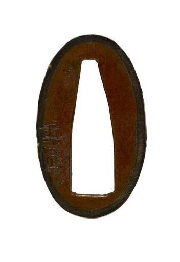 | Keywords: Murakoshi Shigeyuki - Fuchi with Chôryô Holding Kôsekikô's Shoe - Walters 51980 - Mark A.jpg The figure on this fuchi is the Chinese government minister Chry Ch Zhang Liang Chang Liang who lived in the 3rd century BC In his hand is a shoe belonging to the legendary elder Ksekik Ch Huangshi Gong Hwang Shi Kung While riding a mule across a bridge Ksekik dropped his sandal Chry returned it to him As a reward Ksekik gave Chry a book of military strategy Later Chry helped to establish the Han Han Dynasty 207 BC-AD 220 This fuchi is paired with a kashira depicting Ksekik Walters 51 981 ca 1800 Edo shibuichi gold cm 3 7 l accession number 51 980 40531 William T / Henry Walters Collection Baltimore date and mode of acquisition unknown Walters Art Museum Henry Walters Acquired by William T or Henry Walters Signature Shigeyuki place of origin Edo present-day Tokyo Japan Walters Art Museum license Fuchi in the Walters Art Museum Murakoshi Shigeyuki Kōsekikō Chōryō |