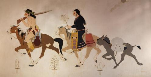 | Keywords: Mural showing Native Americans on horseback by A. Houser at the Interior Department Building, Washington, D.C LCCN2013634092.tif 1 photograph digital tiff file color Notes Gift; Carol M Highsmith; 2009; DLC/PP-2009 083 ; Photographed as part of an assignment for the General Services Administration ; Title date and keywords from information provided by the photographer ; Forms part of Photographs in the Carol M Highsmith Archive ; Credit line Photographs in the Carol M Highsmith Archive Library of Congress Prints and Photographs Division ; The 7 story building is of steel frame construction clad in granite and limestone It consists of a north-south core which bisects six equally spaced transverse wings Designed in 1936 by architect Waddy Butler Wood 2012 Creator Carol M Highsmith Library of Congress Catalog http //lccn loc gov/2013634092 Image download https //cdn loc gov/master/pnp/highsm/18400/18495a tif Original url http //hdl loc gov/loc pnp/highsm 18495 No known restrictions on publication LOC-image highsm 18495 PD-Highsmith Images uploaded by Fæ Photographs by Carol M Highsmith |