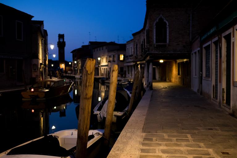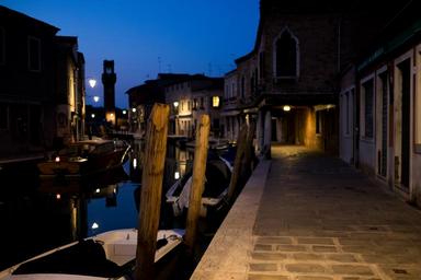 Keywords: murano alley water boot light at night tower blue yellow homes