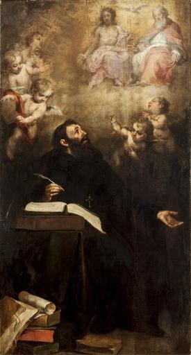 | Keywords: Murillo-san agustin-sevilla-mba.JPG  La obra representa a San Agustín de Hipona uno de los Padres de la Iglesia Católica sentado ante un escritorio en el que se halla un libro abierto en el que el santo debería estar escribiendo Además San Agustín lleva aún una pluma en su mano y aparece en actitud extasiada ante la visión de la Santísima Trinidad circa 1664 1670 oil canvas Size cm 139 250 Institution Museo de Bellas Artes Seville http //ceres mcu es/pages/Main accession number CE0116P http //ceres mcu es/pages/Viewer accion 41 Museo AMuseo MBASE Ninv CE0131P txt_id_imagen 1 txt_rotar 0 txt_contraste 0 txt_zoom 10 cabecera N viewName visorZoom PD-old-100 Paintings of Augustinus in Spain 17th-century paintings of Augustinus Paintings of Saint Augustine by Murillo Paintings by Bartolomé Esteban Murillo in the Fine Arts Museum of Seville 17th-century paintings in the Fine Arts Museum of Seville 1660s paintings in Spain |