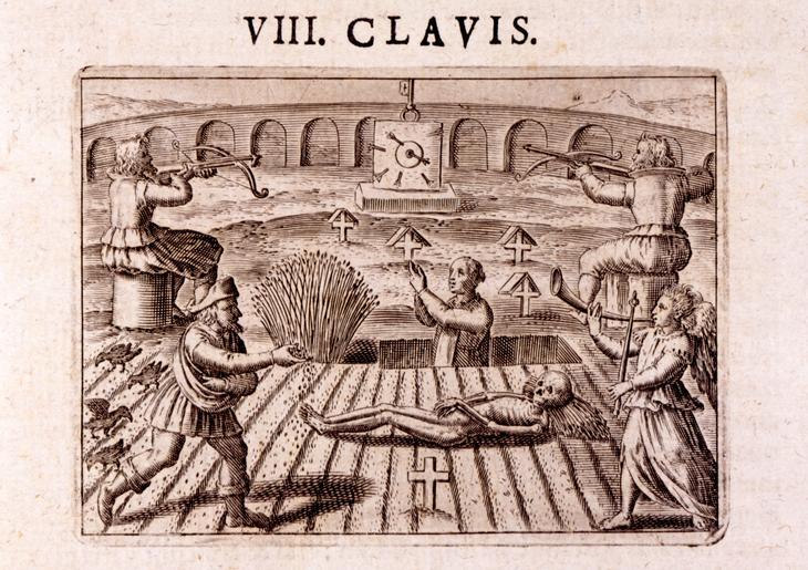 Keywords: Musaeum Hermeticum 1678 VIII. Clavis AQ36 Key 8.tif Matthaeus Merian 1593 “1650 From Tripus aureus hoc est Tres tractatus chymici selectissimi nempe I Basilii Valentini benedictini ordinis monachi Germani practica una cum 12 clavibus et appendice ex germanico; II Thomae Nortoni angli philosophi crede mihi seu ordinale ante annos 140 ab authore seriptum nunc ex anglicano manuscripto in latinum translatum phrasi eujusque authoris ut et sententia retenta; III Cremeri cuiusdam abbatis westmonasteriensis angli testamentum hactenus nondum publicatum nunc in diversarum nationum gratiam editi et figuris cupro affabre incisis ornati operâ et studio Michaelis Maieri phil et med d com p c Francofurti apud Hermannum à Sande MDCLXXVII as published in the collection Musaeum hermeticum reformatum et amplificatum Francofurti Apud Hermannum à Sande 1678 In Latin The part in question 'I Basilii Valentini benedictini ordinis monachi Germani practica una cum 12 clavibus et appendice ex germanico;' or 'Basil Valentine a German monk of the Benedictine order one study with the twelve keys and the appendix translated from the German ' In a walled enclosure two seated men with crossbows aim at a square target with a circular bulls-eye and a key atop it Seven arrows have hit the target Between these two men are four small roofed crosses and an open grave in which a man or resurrected corpse is standing with his hands uplifted On the left of the grave corn is sprouting In the foreground a corpse lies in a ploughed field On the left a man is scattering grain Behind the man four birds are eating the grain Below the corpse is a cross To the right stands a winged angel holding a scepter in its left hand and blowing a trumpet held in its right hand In the eighth key neither human nor animal bodies can be multiplied or propagated without decomposition; the grain and all vegetable seed when cast into the ground must decay before it can spring up again; moreover putrefaction imparts life to many worms and other animalculae http //othmerlib chemheritage org/record b1035996~S6 Catalog Information From the copy in the Roy G Neville Historical Chemical Library http //www chemheritage org/ Chemical Heritage Foundation Downloaded with permission from the Chemical Heritage Foundation as part of the Wikipedian in Residence initiative Chemical Heritage Foundation http //www chemheritage org/ Chemical Heritage Foundation 1678 PD-old-100 PD-old-100 cc-by-3 0 Chemical Heritage Foundation Musaeum Hermeticum Archives Images from the Chemical Heritage Foundation Twelve Keys of Basil Valentine PD-old-100 |