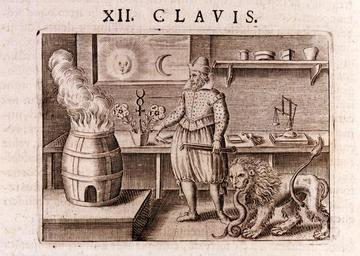 Keywords: Musaeum Hermeticum 1678 XII. Clavis AQ40 Key 12.tif Matthaeus Merian 1593 “1650 From Tripus aureus hoc est Tres tractatus chymici selectissimi nempe I Basilii Valentini benedictini ordinis monachi Germani practica una cum 12 clavibus et appendice ex germanico; II Thomae Nortoni angli philosophi crede mihi seu ordinale ante annos 140 ab authore seriptum nunc ex anglicano manuscripto in latinum translatum phrasi eujusque authoris ut et sententia retenta; III Cremeri cuiusdam abbatis westmonasteriensis angli testamentum hactenus nondum publicatum nunc in diversarum nationum gratiam editi et figuris cupro affabre incisis ornati operâ et studio Michaelis Maieri phil et med d com p c Francofurti apud Hermannum à Sande MDCLXXVII as published in the collection Musaeum hermeticum reformatum et amplificatum Francofurti Apud Hermannum à Sande 1678 In Latin The part in question 'I Basilii Valentini benedictini ordinis monachi Germani practica una cum 12 clavibus et appendice ex germanico;' or 'Basil Valentine a German monk of the Benedictine order one study with the twelve keys and the appendix translated from the German ' Inside a laboratory an alchemist stands holding tongs in his left hand With his right hand he points to a triangular crucible set on a bench with the symbol of Mercury above it from which grow two rose-like flowers Through an open window behind the crucibe the Sun and Moon can be seen To the alchemist's left is a large barrel-shaped furnace from the top of which come flames and smoke To his right are shelves with instruments and books Below them a lion holds the head of a snake in its jaws http //othmerlib chemheritage org/record b1035996~S6 Catalog Information From the copy in the Roy G Neville Historical Chemical Library http //www chemheritage org/ Chemical Heritage Foundation Downloaded with permission from the Chemical Heritage Foundation as part of the Wikipedian in Residence initiative Chemical Heritage Foundation http //www chemheritage org/ Chemical Heritage Foundation 1678 PD-old-100 PD-old-100 cc-by-3 0 Chemical Heritage Foundation Musaeum Hermeticum Archives Images from the Chemical Heritage Foundation Twelve Keys of Basil Valentine PD-old-100 |