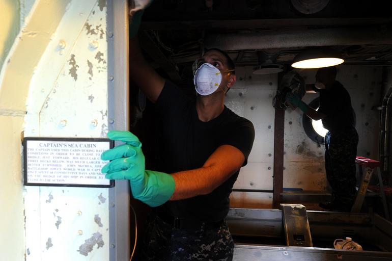 | Keywords: Museum ship 130906-N-PX557-241.jpg en Chief Select Culinary Specialist Kristopher Freyberg assigned to Naval Station Newport and Chief Select Yeoman Raymond Fredrick assigned to Naval Undersea Warfare Center clean the overhead of the captain's sea cabin during a community service project aboard the museum ship USS Massachusetts BB 59 in Fall River Mass Eight chief petty officer selectees performed preservation and restoration work aboard the battleship U S Navy photo by Chief Mass Communication Specialist James E Foehl/Released 2013-09-06 Chief Petty Officer James Foehl https //www dvidshub net/image/1016187 130906-N-PX557-241 2013-09-12 07 08 FALL RIVER MA US PD-USGov-Military-Navy Naval Station Newport Images from DoD uploaded by Fæ |