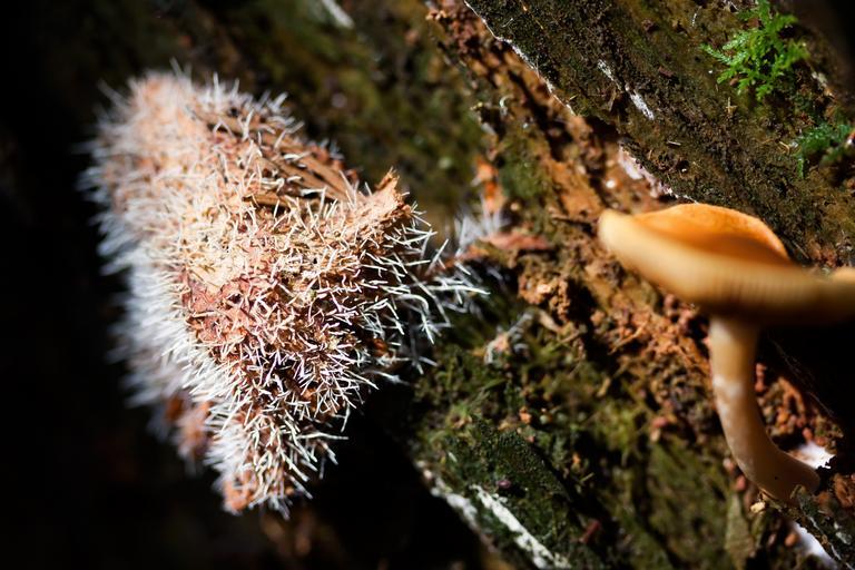 Keywords: mushrooms tree stump prickly break up screen buschelig moss forest flora macro autumn