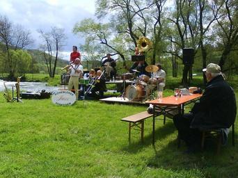 Keywords: music jazz musician instruments jagst river moses mill island water baechlingen langenburg hohenlohe garden garden party landscape hohenloher land nature may father's day ascension spring green meadow sky blue white table benches bubbly bierbaenke sat drums sit seat cheers hustle and bustle joy bank bench out click