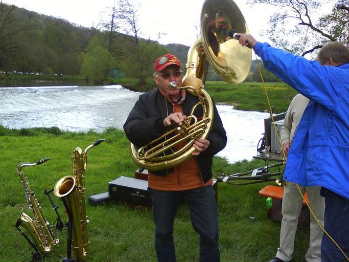 | Keywords: music jazz musician instruments saxophone horn microphone according to jagst river nature moses mill baechlingen langenburg hohenlohe garden party landscape green meadow island water hohenloher land may father's day ascension frisch fromm cheerful free airy sunny spring cap sunglasses anorack |