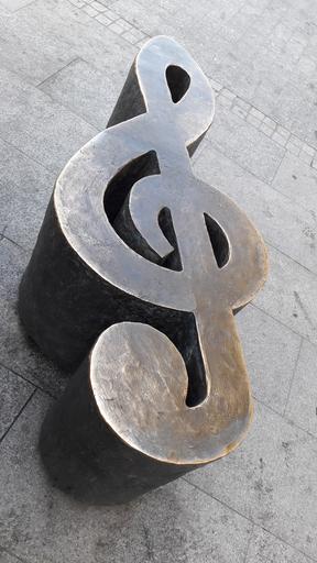 Keywords: music sculpture music theme clef sidewalk chairs