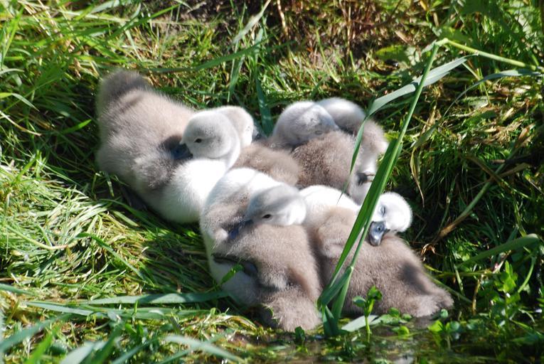 Keywords: mute swan cygnus olor close-up young riverbank cygnets