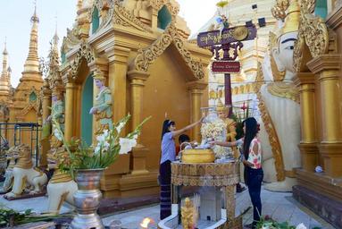 | Keywords: architecture asia bâtiment birman birmanie buddhist burma golden myanmar pagodas rangoon rangoun shwedagon sky stupa temple www.wbayer.com wwwwbayercom La pagode est située à 2 km du centre ville de Yangon, au n°1, Shwedagon Pagoda Road. Elle repose sur une plate-forme pavée de marbre de 5,6 hectares, au sommet de la colline de Singuttara, à 51 m au-dessus de la ville. Elle domine l'horizon. On y accède par des escaliers et des ascenseurs situés aux quatre points cardinaux. Deux chinthes (lions mythiques) monumentaux gardent l'entrée sud ; ils ont été offerts par roi Tharrawaddy lors de sa visite en 18418. La pagode principale se trouve au milieu d'un vaste complexe de 72 autres pagodes, pagodons, salles de prières, tazaungs, pyatthats9 et autres édifices religieux à l'architecture typiquement birmane, ainsi que de très nombreuses statues de bouddhas et de nats. Le stûpa atteint la hauteur de 98 mètres. Sa base est faite de briques recouvertes de milliers de plaques d'or. Elle est entourée d'une forêt de 64 petits pagodons10 qui forment une petite enceinte avec 4 temples plus grands situés aux points cardinaux. Sur la flèche se trouve une sorte d'ombrelle, appelée le hti en birman où sont accrochées 1065 clochettes d'or et 420 clochettes d'argent11, ainsi qu'une girouette ornée de pierres précieuses. Elle se termine par le seinbu, une petite sphère d'or incrustée de milliers de diamants12 dont une émeraude13 de 76 carats. La pagode est située à 2 km du centre ville de Yangon, au n°1, Shwedagon Pagoda Road. Elle repose sur une plate-forme pavée de marbre de 5,6 hectares, au sommet de la colline de Singuttara, à 51 m au-dessus de la ville. Elle domine l'horizon. On y accède par des escaliers et des ascenseurs situés aux quatre points cardinaux. Deux chinthes (lions mythiques) monumentaux gardent l'entrée sud ; ils ont été offerts par roi Tharrawaddy lors de sa visite en 18418. La pagode principale se trouve au milieu d'un vaste complexe de 72 autres pagodes, pagodons, salles de prières, tazaungs, pyatthats9 et autres édifices religieux à l'architecture typiquement birmane, ainsi que de très nombreuses statues de bouddhas et de nats. Le stûpa atteint la hauteur de 98 mètres. Sa base est faite de briques recouvertes de milliers de plaques d'or. Elle est entourée d'une forêt de 64 petits pagodons10 qui forment une petite enceinte avec 4 temples plus grands situés aux points cardinaux. Sur la flèche se trouve une sorte d'ombrelle, appelée le hti en birman où sont accrochées 1065 clochettes d'or et 420 clochettes d'argent11, ainsi qu'une girouette ornée de pierres précieuses. Elle se termine par le seinbu, une petite sphère d'or incrustée de milliers de diamants12 dont une émeraude13 de 76 carats. |