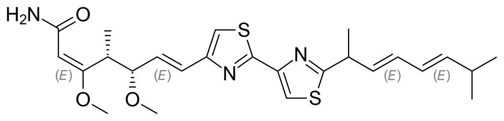 | Keywords: Myxothiazol.svg Skeletal formula of myxothiazol Created using http //www acdlabs com/download/chemsk html ACD/ChemSketch 8 0 and http //www inkscape org Inkscape Own 2007-04-28 Fvasconcellos 21 50 28 April 2007 UTC valid svg Alkene derivatives Antifungals Isopropyl compounds Methyl ethers Thiazoles Unsubstituted primary amides |