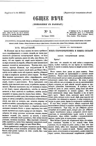 | Keywords: Общее вече N1.jpeg en The title page of issue Общее вече Common Veche the exile-russian publication of Alexander Herzen and Nikolay Ogarev London 1862 ru Пе вая ст аница пе вого номе а издания Ге цена и Ога ёва Общее вече Лондон Вольная усская типог афия 1862 год Отскани овано с факсимильного издания 1964 года Сделал сам А И Ге цен П Ога ёв 1862-07-15 PD-old Newspapers of the Russian Empire Kolokol Free Russian Press Title pages from Russia 15 July Newspapers of Russia 1862 Published in London |