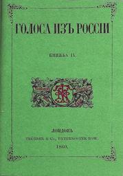 Keywords: Голоса из России. N9. Обложка..jpg en The title page of issue Golosa iz Rossii Voices from the Russia the exile-russian publication of Alexander Herzen and Nikolay Ogarev London 1860 ru Обложка девятого последнего выпуска издания Ге цена и Ога ёва Голоса из России Лондон Вольная усская типог афия 1860 год Отскани овано с факсимильного издания 1976 года Сделал сам А И Ге цен П Ога ёв 1860 PD-old Golosa iz Rossii Title pages from Russia