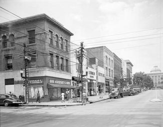 Keywords: blackandwhite monochrome outdoor road building architecture black and white Carolina Power and Light linemen at work on wires on Fayetteville Street, Raleigh, NC, July 13, 1950. From the Barden Collection, North Carolina State Archives, Raleigh, NC. Carolina Power and Light linemen at work on wires on Fayetteville Street, Raleigh, NC, July 13, 1950. From the Barden Collection, North Carolina State Archives, Raleigh, NC.