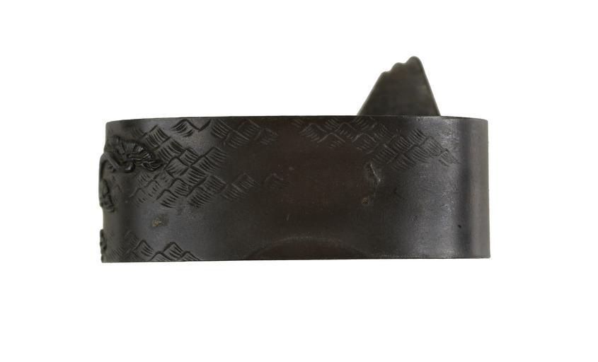 Keywords: Nagamitsu - Fuchi with Mt Fuji - Walters 511048 - Back.jpg The peak of Mt Fuji rises over the edge of the fuchi on the left side The top is decorated in silver mimicking the snow that often covers the mountain peak Mt Fuji is the most sacred mountain in Japan and is a popular tourist destination Pine trees are shown along the right edges and waves are on the reverse This is part of a set with Walters 51 1047 century 18 19 Edo shibuichi gold cm 3 7 accession number 51 1048 19941 William T / Henry Walters Collection Baltimore date and mode of acquisition unknown Walters Art Museum Henry Walters Acquired by William T or Henry Walters Signature Nagamitsu kao place of origin Japan Walters Art Museum license Fuchi in the Walters Art Museum Media contributed by the Walters Art Museum needs category review Nagamitsu |