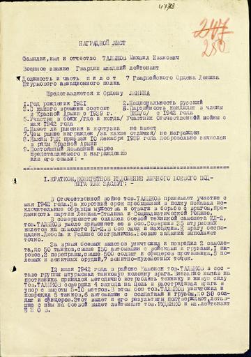 Keywords: Nagr List Talykov 1.jpg Official document for awarding Mikhail Talykov with order of Lenin Mihhail Talõkovile Lenini ordeni andmise käskkiri ru аг адной лист с подтве ждением подвига 1 1942-11-14 PD-RU-exempt SeoSaytum other versions Documents of the Soviet Union 1942 November 1942 in the Soviet Union 1942-11-14