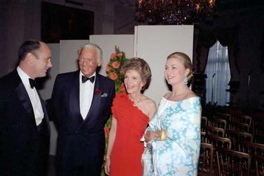 Keywords: Nancy Reagan Douglas Fairbanks, Jr. Grace Kelly.jpg First Lady Nancy Reagan posing with Douglas Fairbanks Jr and Grace Kelly Peter McCoy at far left during a dinner at Winfield House during trip to London for the Royal Wedding of Prince Charles and Diana Princess of Wales http //www reagan utexas edu/archives/photographs/large/C3326-14A jpg 1981-07-26 White House photo office PD as official government record PD-USGov Nancy Reagan after 1989 Douglas Fairbanks Jr Grace Kelly |