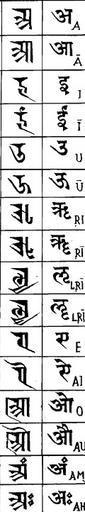 Keywords: Nandinagari and Devanagari.jpg en Comparison between the vowel letters of Devanagari script and the historical Nandinagari script of India own Trini1988 Cc-zero Alphabet charts