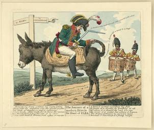 Keywords: Napoleon's exile to Elba.jpg The journey of a modern hero to the island of Elba Print shows Napoleon I seated backwards on a donkey on the road to Elba from Fontainebleau; he holds a broken sword in one hand and the donkey's tail in the other while two drummers follow him playing a farewell march Includes twelve lines of verse Original source 1 print etching hand-colored ; 18 9 x 22 7 cm sheet Library of Congress CALL NUMBER PC 2 - Journey of a modern hero A size P P 1814-05 Pub'd by J Phillips No 32 Charles Street Hampstead road London Unrestored version of Image Napoleon's exile to Elba3 jpg PD-old-100 Napoleon on Elba Caricatures of Napoleon I of France |