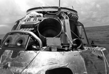 | Keywords: Official NASA caption for this photo: "APOLLO 15 PACIFIC RECOVERY AREA – This unusual view of the Apollo 15 spacecraft was taken during recovery operations today in the Pacific Ocean at the conclusion of the nation’s fourth manned lunar landing mission. Key elements in the spacecraft’s earth landing system are shown. The large canister-like structure in the center in the center of the picture is one of two drogue mortar cans. Each houses a drogue parachute and the mortar shell which activates it when the spacecraft descends to 24,000 feet prior to splashdown. The drogue chutes orient and slow the spacecraft so that the main parachutes can be safely deployed. The second drogue mortar can is located adjacent to the one described at the viewer’s left. The smaller canister to the right and below the center drogue mortar can is one of three pilot parachute mortar cans. Activated at 10,000 feet, each pilot chute pulls out one of the spacecraft’s three main (large) parachutes housed in a compartment above it. To the left and below the center drogue mortar can, at the viewer’s left, are two reaction control thrusters used to stabilize the spacecraft during reentry. The spacecraft hatch is partially shown under these reaction control thrusters. The dark area in the lower center of the view is a side window. (Note the burned ablative material and exposed honeycomb caused by reentry temperatures.)” Official NASA caption for this photo: "APOLLO 15 PACIFIC RECOVERY AREA – This unusual view of the Apollo 15 spacecraft was taken during recovery operations today in the Pacific Ocean at the conclusion of the nation’s fourth manned lunar landing mission. Key elements in the spacecraft’s earth landing system are shown. The large canister-like structure in the center in the center of the picture is one of two drogue mortar cans. Each houses a drogue parachute and the mortar shell which activates it when the spacecraft descends to 24,000 feet prior to splashdown. The drogue chutes orient and slow the spacecraft so that the main parachutes can be safely deployed. The second drogue mortar can is located adjacent to the one described at the viewer’s left. The smaller canister to the right and below the center drogue mortar can is one of three pilot parachute mortar cans. Activated at 10,000 feet, each pilot chute pulls out one of the spacecraft’s three main (large) parachutes housed in a compartment above it. To the left and below the center drogue mortar can, at the viewer’s left, are two reaction control thrusters used to stabilize the spacecraft during reentry. The spacecraft hatch is partially shown under these reaction control thrusters. The dark area in the lower center of the view is a side window. (Note the burned ablative material and exposed honeycomb caused by reentry temperatures.)” |