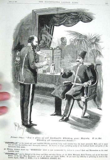| Keywords: Nasser-ed-Din Shah's last visit to Britain - 2.jpg Qajar Shah in Bushmill Irish Whiskey advert http //www iranian com/Pictory/2005/June/q2 html 1889-08 Illustrated London News PD PD-old ILN 1889 Naser al-Din Shah Qajar Old Bushmills distillery Northern Ireland in the 19th century Advertisements in the United Kingdom 1889 advertisements |
