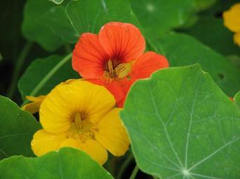 Keywords: nasturtium cress blossom bloom flower calyx yellow strong red orange carbine greenhouse leaves colorful