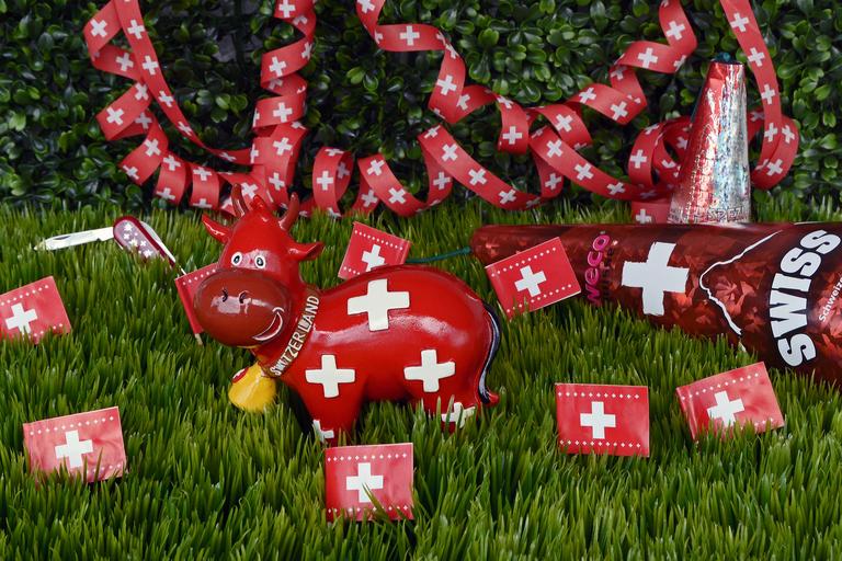 Keywords: national day switzerland celebrate souvenirs flag swiss flag sac diameter cup cow streamer meadow grass green red white fireworks volcano explosion night color cracker dark beautiful light 1 august