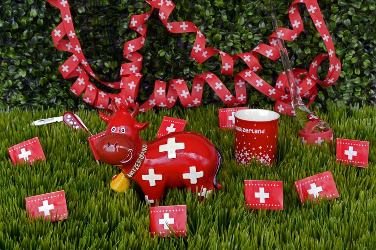 Keywords: national day switzerland celebrate souvenirs flag swiss flag sac diameter alphorn cup cow streamer meadow grass green red white fireworks explosion night color cracker dark beautiful light 1 august