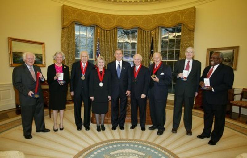| Keywords: National Humanities Medal Winners for 2003.jpg en President George W Bush stands with the recipients of the 2002 National Humanities Medal in the Oval Office Thursday Feb 27 2003 From left they are Joseph McDade who accepts the award on behalf of Frankie Hewitt of Ford's Theatre; Ellen Carroll Walton who accepts the award on behalf of the Mount Vernon Ladies' Association of the Union; Dr Donald Kagan of Yale University; author Patricia MacLachlan; Brian Lamb of C-SPAN; Art Linkletter of the United Seniors Association; Frank Conroy who accepts the award on behalf of the Iowa Writers' Workshop; and Justice Clarence Thomas who accepts the award on behalf of Dr Thomas Sowell of the Hoover Institution White House photo by Paul Morse 2003-02-27 http //georgewbush-whitehouse archives gov/news/releases/2003/02/images/20030227-21_d022703-515h html Paul Morse Art Linkletter with Humanities Medal jpg PD-USGov Uploaded with UploadWizard George W Bush in 2003 Clarence Thomas National Humanities Medal United States Art Linkletter Photographs by Paul Morse |