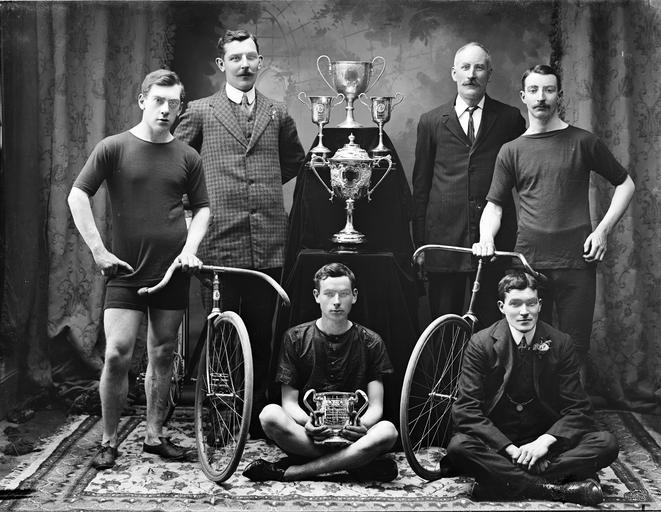 Keywords: south eastern wheelers southeasternwheelers cycling bicycles sport cyclists moustaches cups awards silverware tyler challenge cup tylerchallengecup south of ireland challenge cup southofirelandchallengecup sunday 4th july 1909 1900s 20th century 20thcentury a.h. poole ahpoole arthur henri poole arthurhenripoole glass negative glassnegative waterford bicycle club waterfordbicycleclub national library of ireland nationallibraryofireland poole photographic collection poolephotographiccollection blackandwhite groupshot people monochrome team sport public domain blackandwhite monochrome sport team sport people black and white Abarophobia asked to see a second shot of this Waterford Bicycle Club team with their silverware. There's something very strange going on with all of their faces, but the trophies are far clearer in this one... Again, this one was ordered by a Mr Keane, who may have lived or worked on Henrietta Street, Waterford. Date: Sunday, 4 July 1909 NLI Ref: POOLEWP 1944 You can also view this image, and many thousands of others, on the NLI’s catalogue at catalogue.nli.ie Abarophobia asked to see a second shot of this Waterford Bicycle Club team with their silverware. There's something very strange going on with all of their faces, but the trophies are far clearer in this one... Again, this one was ordered by a Mr Keane, who may have lived or worked on Henrietta Street, Waterford. Date: Sunday, 4 July 1909 NLI Ref: POOLEWP 1944 You can also view this image, and many thousands of others, on the NLI’s catalogue at catalogue.nli.ie Public Domain: National Library of Ireland on The Commons Public Domain: National Library of Ireland on The Commons |