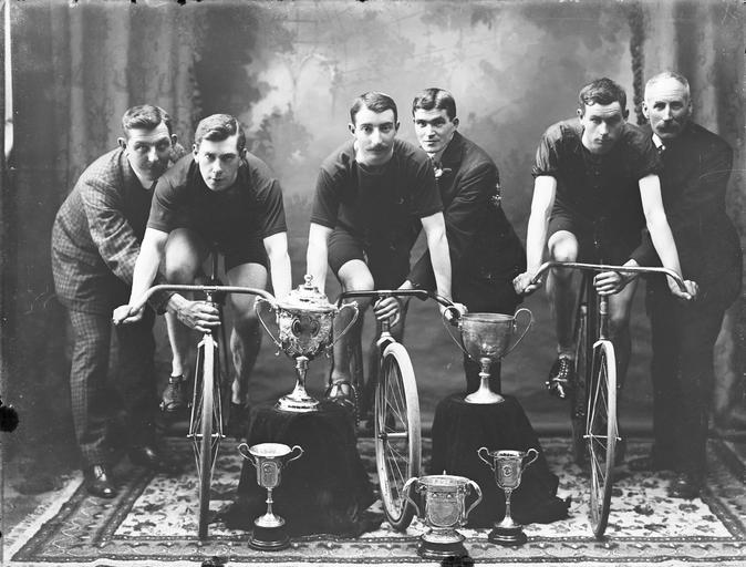 Keywords: south eastern wheelers southeasternwheelers cycling bicycles sport cyclists moustaches cups awards silverware tyler challenge cup tylerchallengecup south of ireland challenge cup southofirelandchallengecup sunday 4th july 1909 1900s 20th century 20thcentury a.h. poole ahpoole arthur henri poole arthurhenripoole glass negative glassnegative waterford bicycle club waterfordbicycleclub national library of ireland nationallibraryofireland poole photographic collection poolephotographiccollection people groupshot blackandwhite monochrome team sport musician performer public domain blackandwhite monochrome sport team sport people performer musician black and white John Spooner, of this parish, suggested "In commemoration of Ireland's first track cycling medal since 1896, (a silver won by Martyn Irvine two weeks ago in Minsk, followed an hour later by a gold) how about a picture with some bicycles..." Presenting therefore the South Eastern Wheelers from Waterford Bicycle Club! Think that this photo was ordered by a Mr Keane, perhaps of Henrietta Street, Waterford. As to the silverware, from what I can make out of the wording: Squat one on the ground (middle) = The "Tyler" Challenge Cup, 1909 Tall one on the ground (right) = South Eastern Wheelers One on stand (right) = W B C South of Ireland Challenge Cup Date: Sunday, 4 July 1909 NLI Ref: POOLEWP 1945 You can also view this image, and many thousands of others, on the NLI’s catalogue at catalogue.nli.ie John Spooner, of this parish, suggested "In commemoration of Ireland's first track cycling medal since 1896, (a silver won by Martyn Irvine two weeks ago in Minsk, followed an hour later by a gold) how about a picture with some bicycles..." Presenting therefore the South Eastern Wheelers from Waterford Bicycle Club! Think that this photo was ordered by a Mr Keane, perhaps of Henrietta Street, Waterford. As to the silverware, from what I can make out of the wording: Squat one on the ground (middle) = The "Tyler" Challenge Cup, 1909 Tall one on the ground (right) = South Eastern Wheelers One on stand (right) = W B C South of Ireland Challenge Cup Date: Sunday, 4 July 1909 NLI Ref: POOLEWP 1945 You can also view this image, and many thousands of others, on the NLI’s catalogue at catalogue.nli.ie Public Domain: National Library of Ireland on The Commons Public Domain: National Library of Ireland on The Commons |