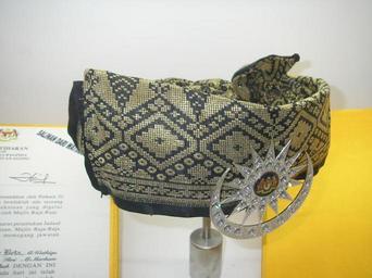 | Keywords: National Museum KL 2008 (118).JPG The Royal Headgear Solek Dendam Tak Sudah This black songket headgear embroidered with gold thread is worn by the Yang di-Pertuan Agong during his Royal Installation Ceremony and important state ceremonies The headgear is folded in the style of Dendam Tak Sudah which originates from the state of Negeri Sembilan Fixed on the right of this headdress is a platinum crescent with fourteen-pointed stars In the centre of the star is the crest of the Malaysian government Solek Dendam Tak Sudah Destar Diraja Destar dari kain songket berwarna hitam bersulam benang emas ini dipakai oleh Seri Paduka Baginda Yang di-Pertuan Agong Malaysia semasa Hari Pertabalan dan upacara rasmi negara Ikatan ini berasal dari Negeri Sembilan Di sebelah hadapn tengkolok ini dipasangkan 'jata' yang berbentuk anak bulan dengan bintang pecah empat belas yang diperbuat daripada emas putih dan di tengah-tengahnya terletak lambing Kerajaan Malaysia Own 2008-01 Gryffindor Royal Headgear Songket |