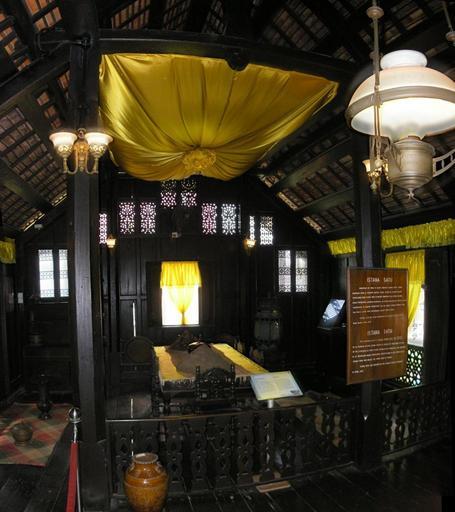 | Keywords: National Museum KL 2008 Istana interior pano.jpg  The guest hall of the Istana Satu First Palace is furnished with a cupboard that is made of carved wood with gold inlaid and complete with a mirror The cupboard is used to store small decorative items A hanging lamp is positioned from ceiling A brass foot tray with legs is placed in the hall of visitors Spread out is a mat made out of mengkuang leaves a Malay feature to honour guests Adding to the royal ambience of the central hall are brass shields mounted on the left and right walls The kitchen of the Istana Satu First Palace is made from wood carved with floral motifs Arranged on the table are a food cover made of woven mengkuang leaves and brass tray symbolising the pride and identity of the Malay race together with a glass lamp The cupboard is where the kitchen utensils are stored The decorative items are simple yet full of artistic and cultural meaning Own 2008-01 Gryffindor Istana Satu |