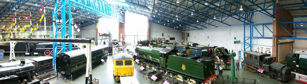 Keywords: National Railway Museum York 15 March 2009 Great Hall panorama 3.jpg The Great Hall of the National Railway Museum in York photographed from the top of the historic passenger footbridge display image looking north over the exhibits surrounding the NRM turntable Rail access to two of the turntable roads can be achieved through the two roller shutters formed in the right hand window at the far end of the hall Rail access to the south west corner of the Hall and through to the workshops is possible through the roller shutter door on the right hand side which is angled to the main wall own 2009-03-15 User Ultra7 53 960485 -1 095961 region GB_heading NW The Great Hall National Railway Museum York interior wide angle |