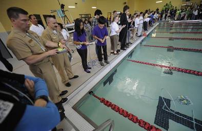Keywords: National SeaPerch Challenge 120412-N-PO203-002.jpg en Capt Robert Palisin left deputy department head for the sea warfare and weapons department at the Office of Naval Research and Master Chief Machinist's Mate Frank Gardner from Commander Submarine Force U S Atlantic Fleet judge Highland Intermediate School students from Pearl City Hawaii during the ONR-sponsored National SeaPerch Challenge at the Manassas Park Community Center in Manassas Va The SeaPerch program provides students with the opportunity to learn about robotics engineering science and mathematics while building an underwater remotely operated vehicle as part of a science and engineering technology curriculum 2012-04-12 John Williams https //www dvidshub net/image/559148 120412-N-PO203-002 2012-04-13 23 09 MANASSAS PARK VA US PD-USGov-Military-Navy Office of Naval Research Images from DoD uploaded by Fæ |