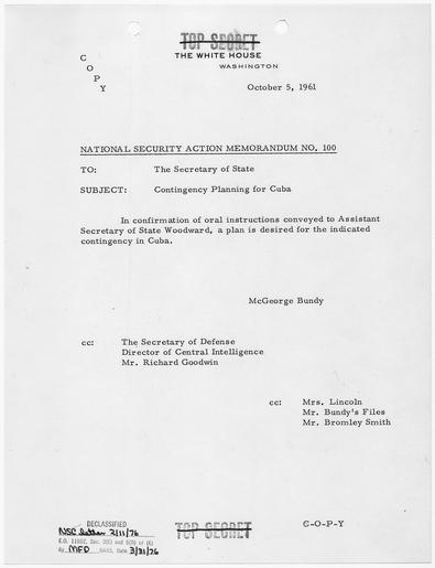 | Keywords: National Security Action Memorandum No. 100 Contingency Planning for Cuba - NARA - 193493.tif Scope and content Memorandum for Secretary of State on contingency planning for Cuba General notes 193493 Local identifier President 1961-1963 Kennedy Office of the Special Assistant to the President for National Security Affairs 01/20/1961 - 11/22/1963 NARA-Author Bundy McGeorge 1919-1996 Author 1128212 <br /> John F Kennedy Library NLJFK Columbia Point Boston MA 02125-3398 1961-10-05 Record group Collection JFK-NSF Papers of President Kennedy National Security Files 01/20/1961 - 11/22/1963 Record group ARC 1164 National Security Files Meetings and Memoranda compiled 1961 - 1963 Series ARC 193354 File unit National Security Files Meetings and Memoranda National Security Action Memoranda 02/03/1961 - 11/13/1963 File unit ARC 193400 Variant control numbers NAIL Control Number NLK-NSF-MM-NSAM-10EEEC yes Other versions <gallery> File National_Security_Action_Memorandum_No _100_Contingency_Planning_for_Cuba_-_NARA_-_193493 tif tif File National_Security_Action_Memorandum_No _100_Contingency_Planning_for_Cuba_-_NARA_-_193493 jpg jpg </gallery> NARA-cooperation PD-USGov Presidential Decision Directives Kennedy NARA TIF images with categorized JPGs |